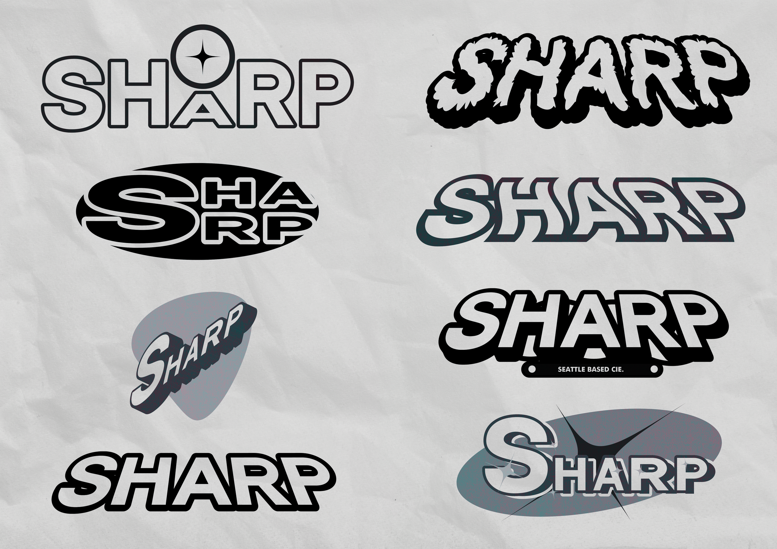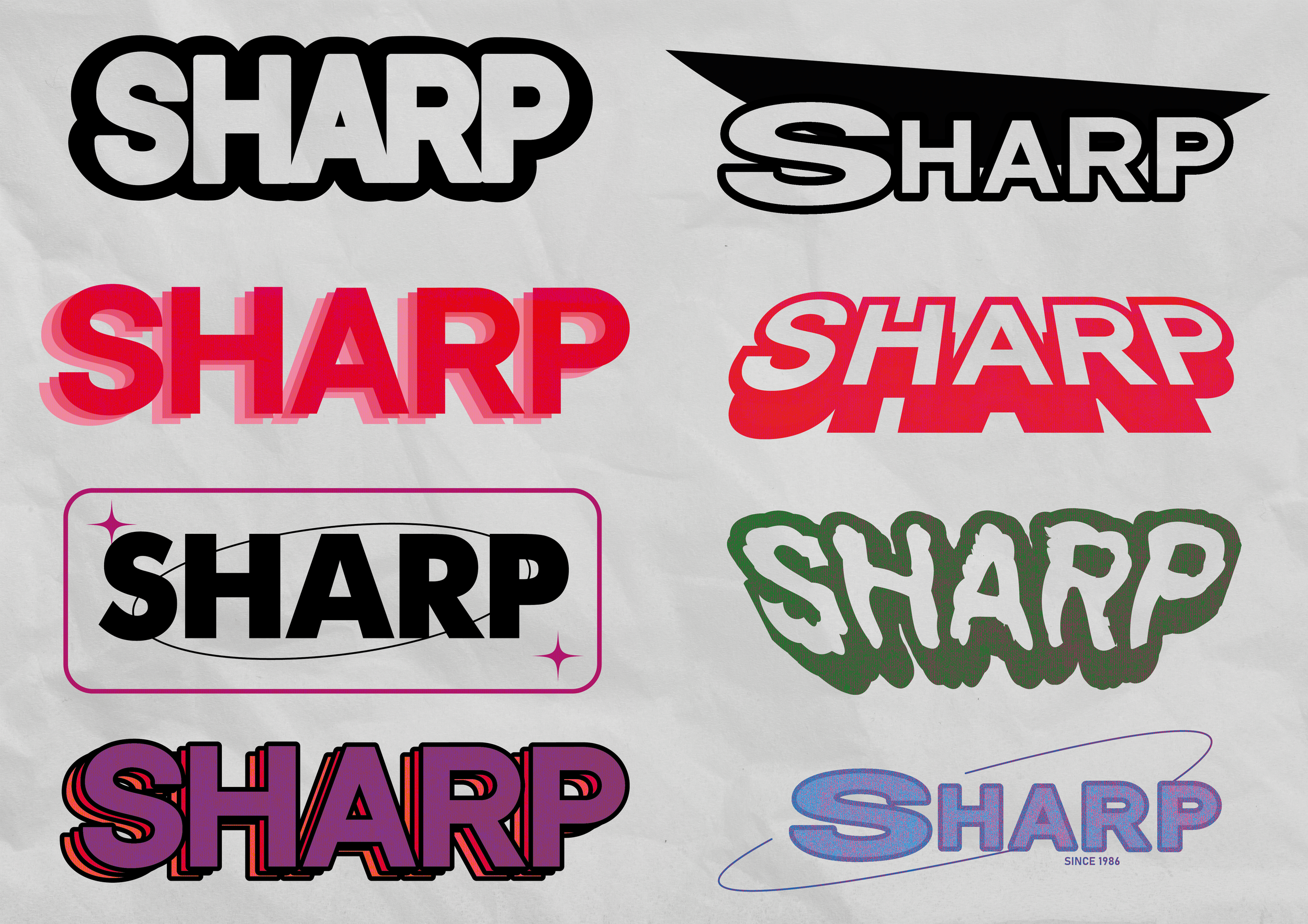 Creation of logotypes with the word ”Sharp”, in different styles for multiple use and various brands.